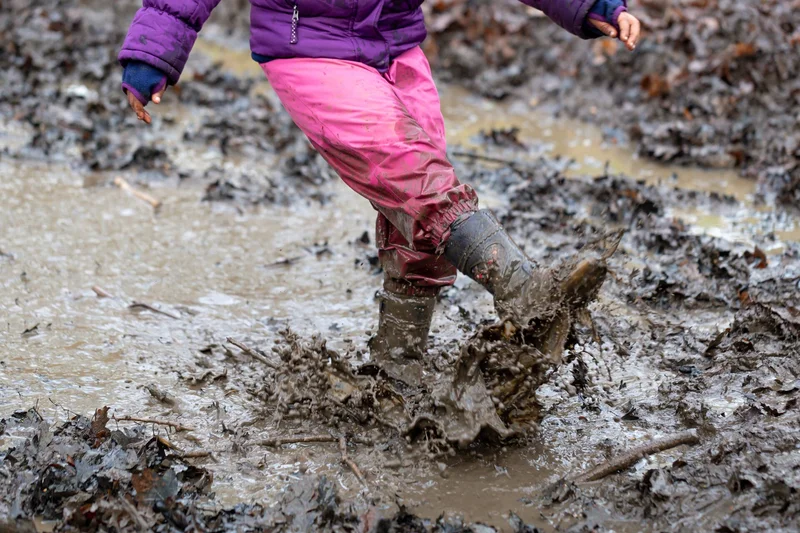 Ребенок идет по грязной луже. Источник фото: 123rf.com