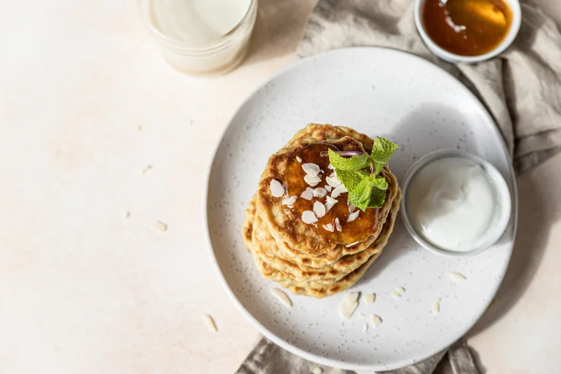 - Отрегулировать средний огонь. Испечь небольшие толстые блинчики (стандартный размер американских панкейков – 14 см), прикрывая антипригарную сковородку крышкой.