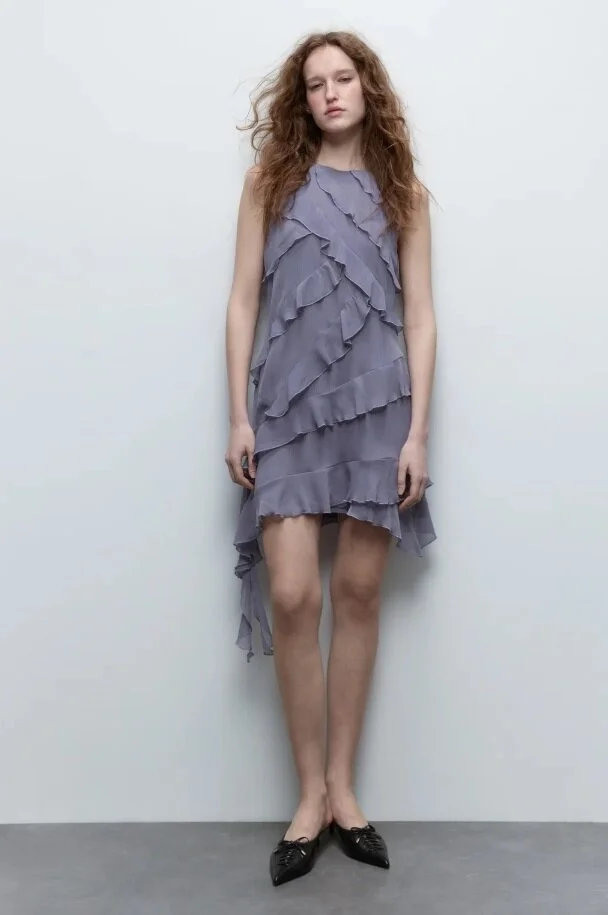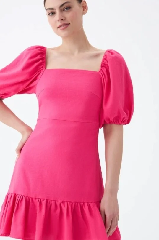 Розовое платье с пышными рукавами-воланами будет прекрасно смотреться с туфлями на каблуке и завитыми локонами на выпускном, а в повседневной жизни — с кедами и собранными в пучок волосами.