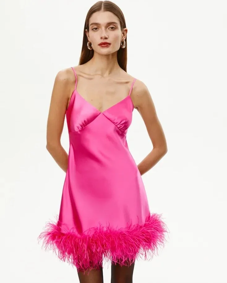 Яркое сатиновое платье цвета фуксия с перьевой опушкой — современная классика выпускных. Будет гармонично смотреться как с босоножками на каблуке, так и с грубыми ботинками — фаворитом юных бунтарок.