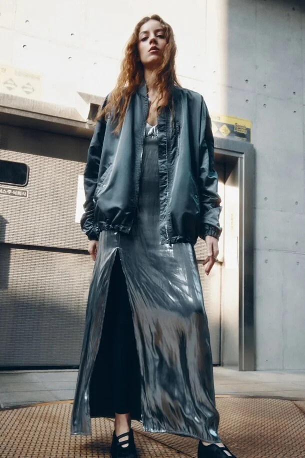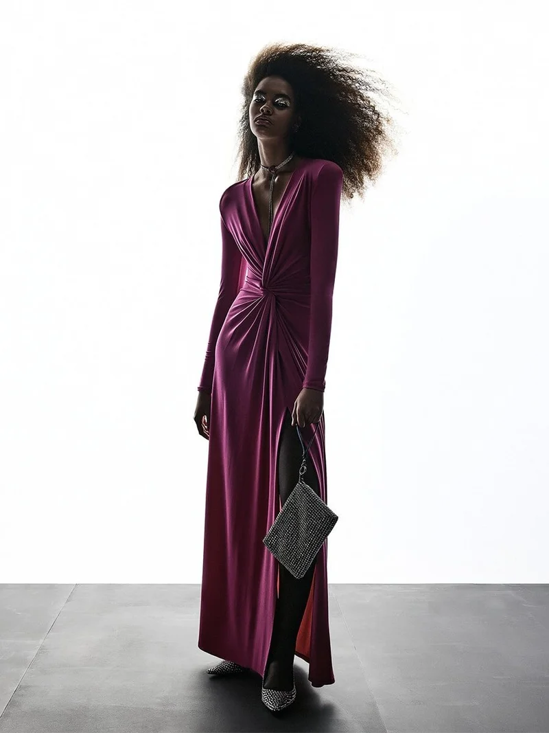 Серебристое макси-платье с разрезом — отличный выбор для выпускного. Во время официальной части будет прекрасно смотреться с каблуками и клатчем, а после, впишется в casual-образ.