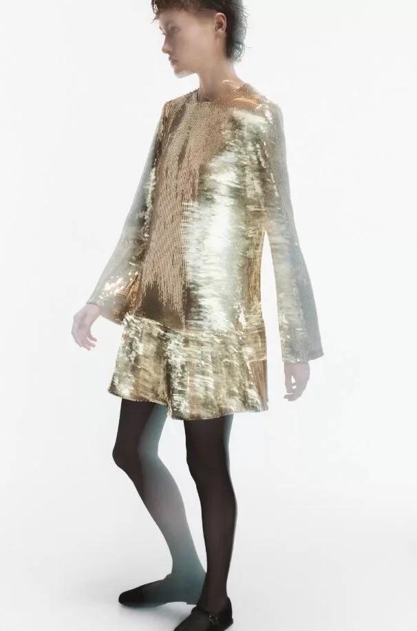 Еще один праздничный металлик от Befree для девчонок, которые не любят каблуки и открытые руки. Золотое мини-платье можно надеть с балетками или все теми же грубыми ботинками на тракторной подошве.