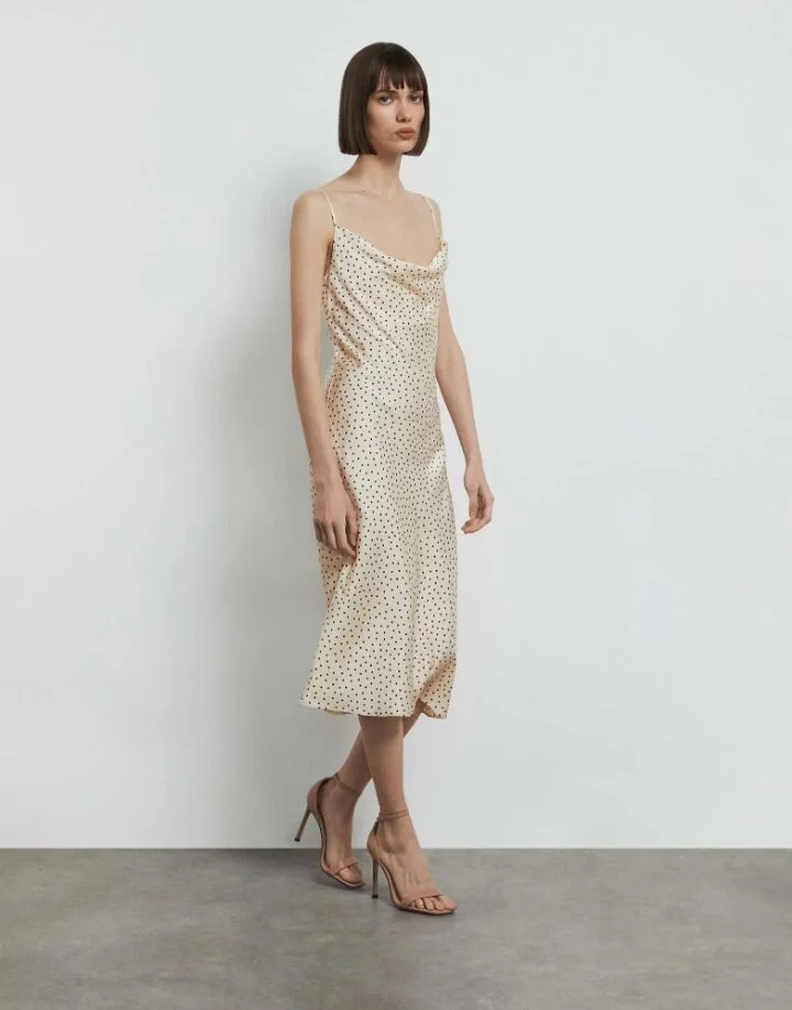 Классическое сатиновое платье-комбинация в горошек, пожалуй, самый универсальный вариант платья на выпускной. Такое платье остается в тренде уже несколько сезонов, смело входя в базовый гардероб модниц всех возрастов.