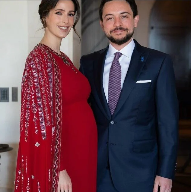 Беременная супруга наследного принца Хусейна продемонстрировала свой заметно подросший живот в великолепном красном платье, специально созданном для нее известным саудовским дизайнером Хонайдой Серафи.