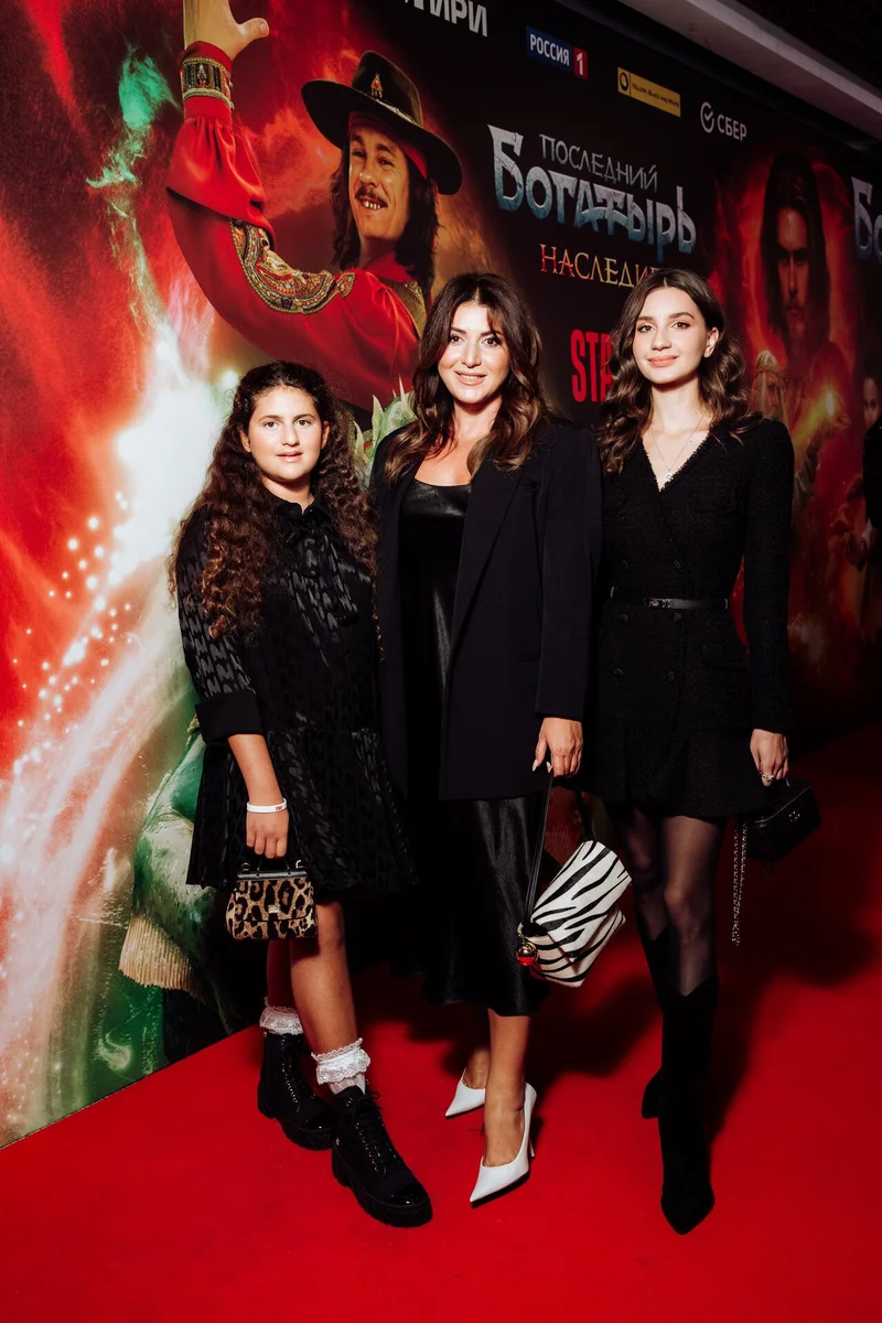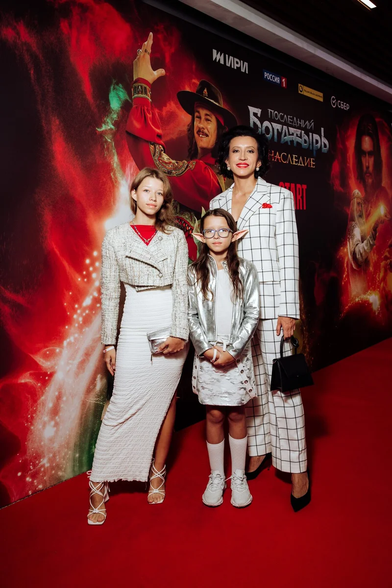 Владислав Ветров, исполняющий роль Белогора, был в компании дочерей — 27-летней Анастасии и 10-летней Елизаветы. Их наряды прекрасно сочетались с образом отца: оба выбрали черные пиджаки и брюки, создавая единый стильный ансамбль.